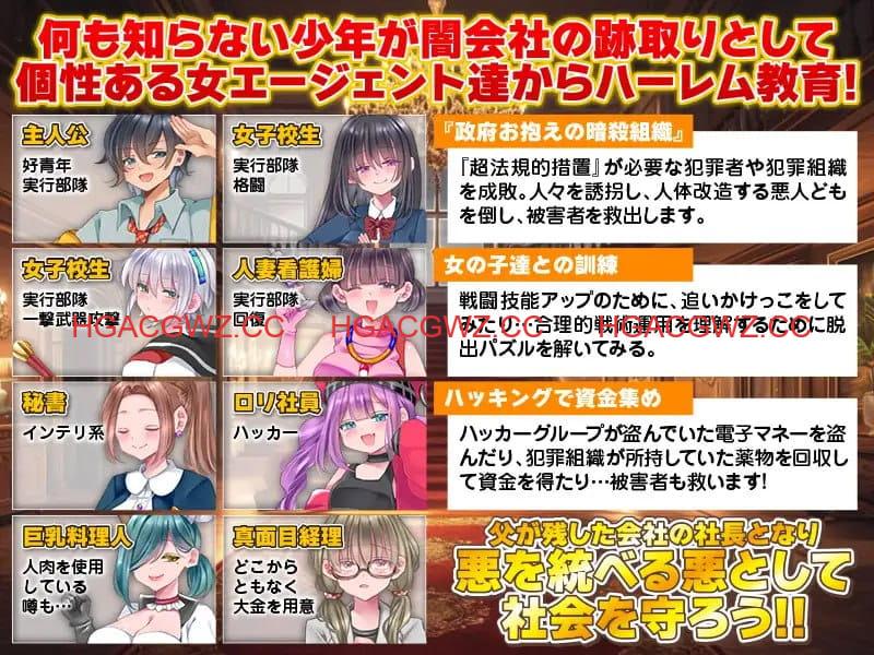 父亲留下的黑暗业务公司一无所知的少年作为黑暗公司的继承者,接受个性鲜明的女特工们的后宫式教育!【住宿制特工教师的后宫生活】■每日遭遇幸运的艳遇与女性们同居的生活!窥探特工与组织成员们的日常!■过于亲密的私人教师为了成为适合邪恶组织的男人,与性格各异的角色进行一对一授课!直接刺激色欲的邪恶诱惑生活!■换装让后宫感倍增!让她们换上极限暴露的服装或变态Cosplay服装生活!
